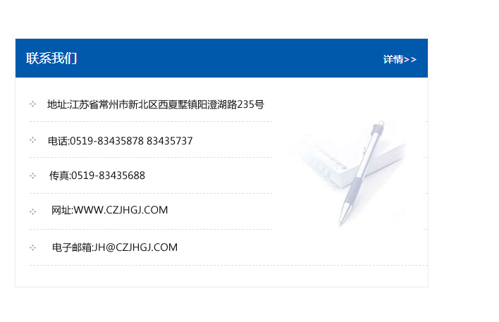 地址:常州市新北區友邦商務大廈1幢16、17層  電話:0519-85101652  傳真:0519-85112595  郵編:213022  網址:www.cz-jiayue_cn.nuodejixie.com  郵箱:xiajifengaa@163.com
